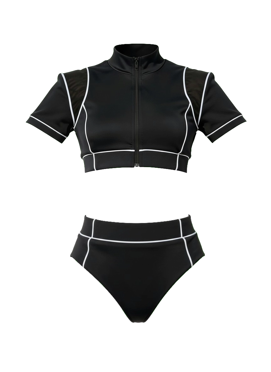 Sporty Design: Black base with white piping and a functional front zipper for a dynamic look.