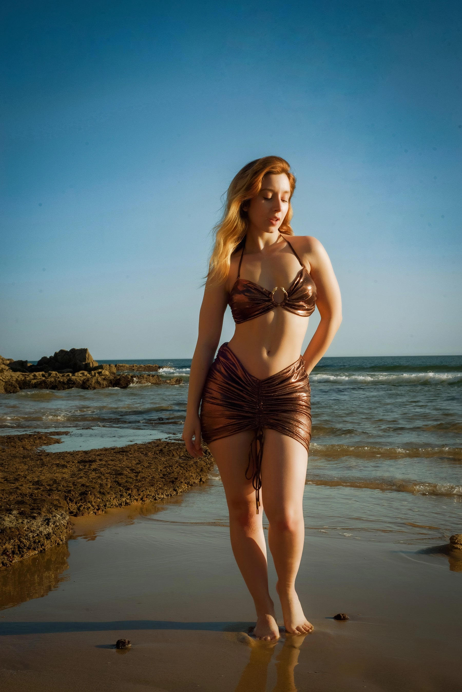 Complete the Medusa-inspired look with this stunning bronze snakeskin-textured skirt, designed to complement the Medusa swimsuit and bikini. Featuring the same glistening fabric that catches the light beautifully, this adjustable V-cut skirt is perfect as a chic beach cover-up with The Medusa Bikini, or as a statement piece with The Medusa Swimsuit. The adjustable drawcords allow you to tailor the length to suit your shape or style, while the v-cut waistline enhances your silhouette for a flattering and confident look.
