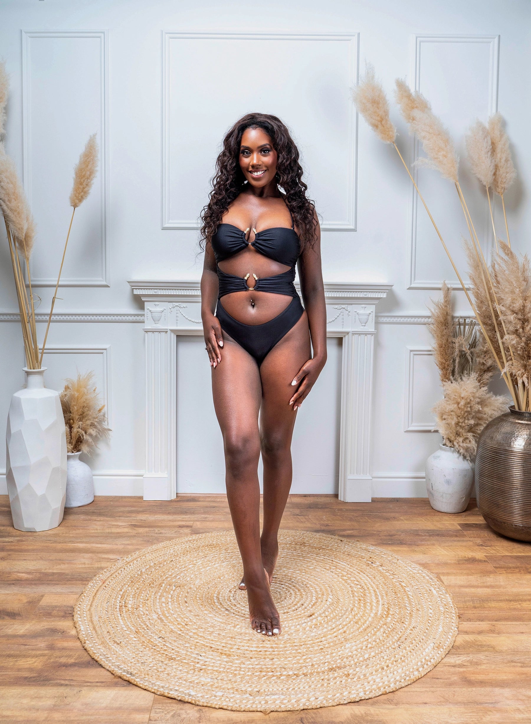 Step into your power with the Black Medusa Swimsuit, a fierce fusion of seduction and sophistication. Drenched in a luxe black shimmery fabric that catches the light with every movement, this sculptural silhouette is finished with striking gold snake hardware at the centre.. an ode to the mystique of Medusa herself.